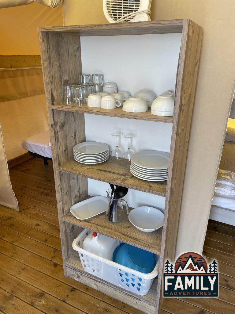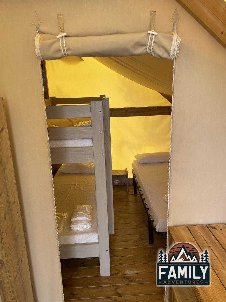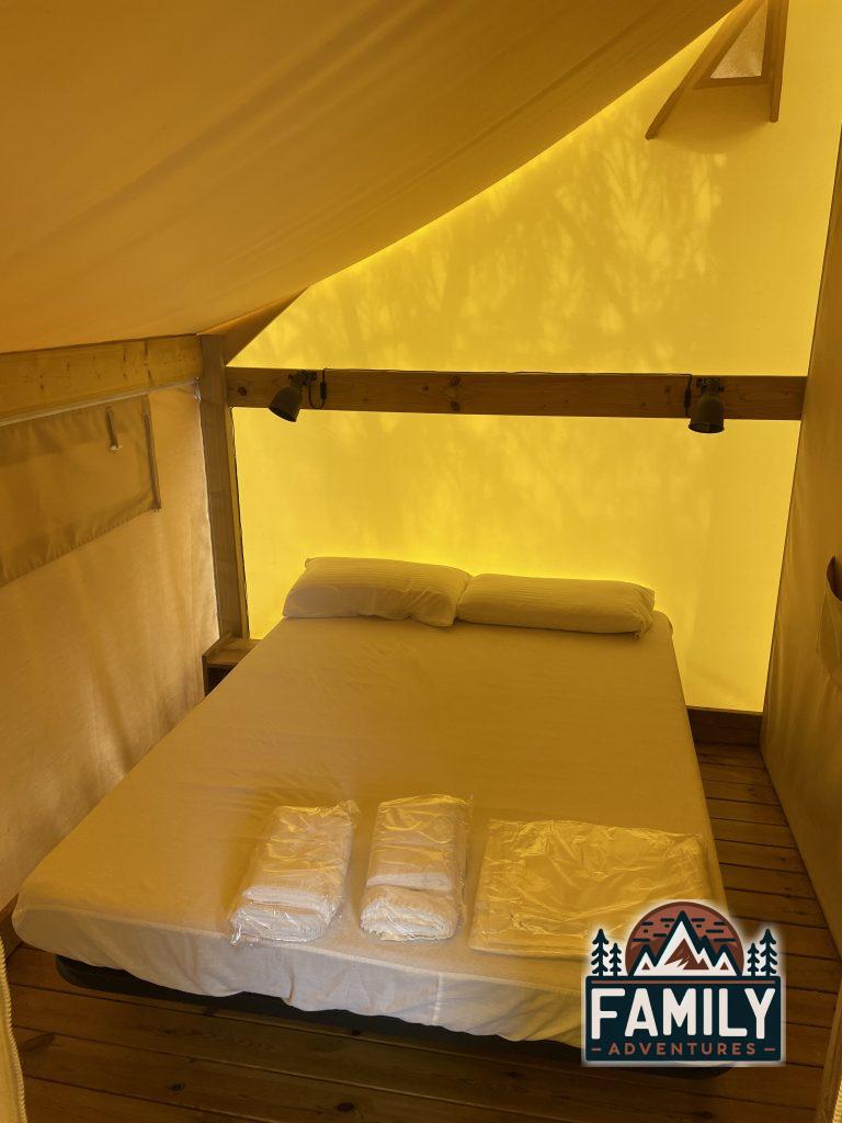 Unsere Unterkunft war ein großes, feststehendes Zelt mit einem Doppelbett, einem Einzelbett und einem Hochbett, also genau passend für uns und die drei Kinder. Die Unterkunft war auch ausgestattet mit Kochutensilien, Kühlschrank, Elektroherd, Esstisch und Hockern.