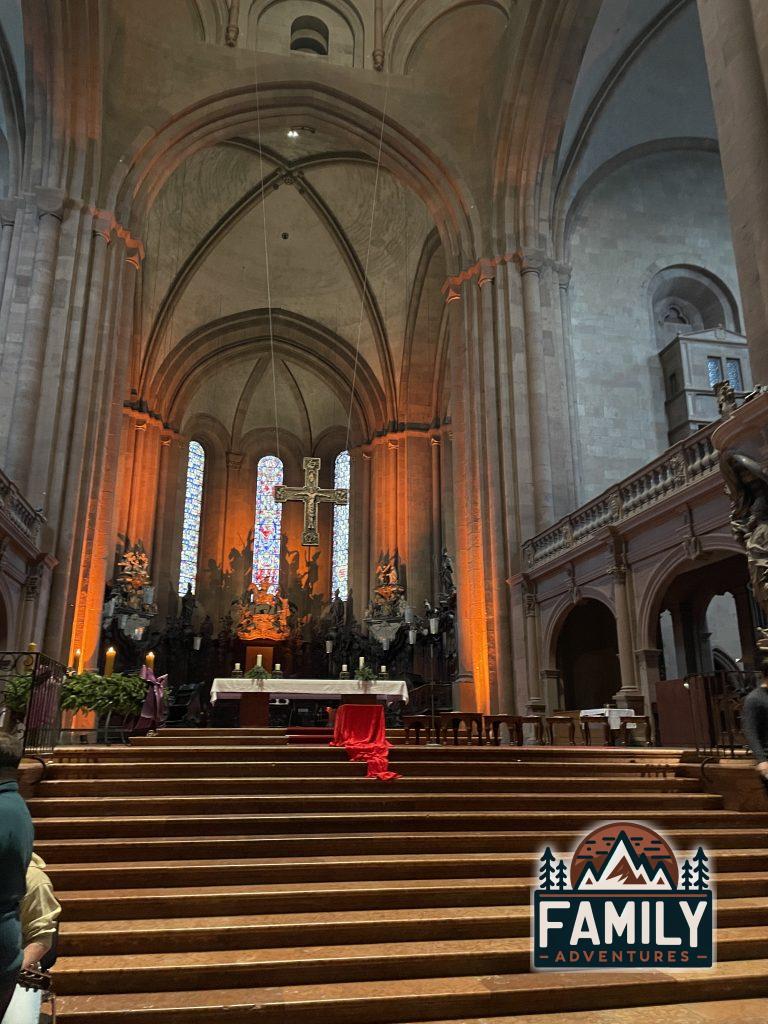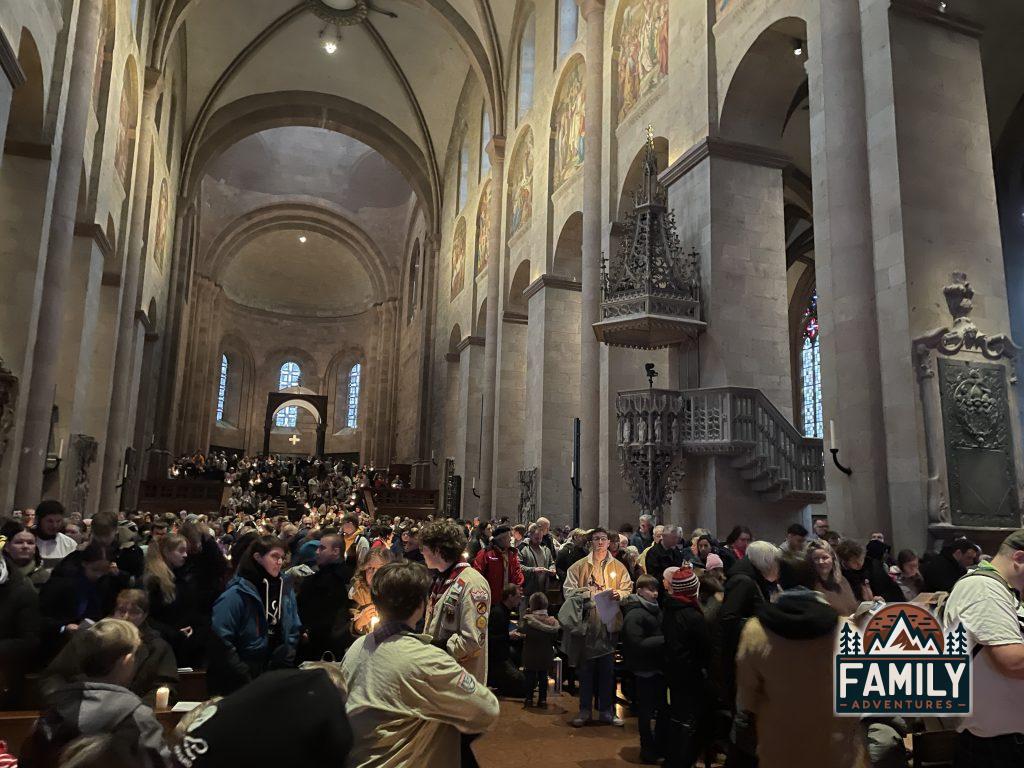 Um 14:30 Uhr begann der zentrale Aussendungsgottesdienst, der von Bischof Dr. Peter Kohlgraf geleitet wurde. Dieser Gottesdienst im Mainzer Dom ist eine der größten Veranstaltungen des DPSG-Diözesanverbands Mainz und bringt viele Pfadfinderinnen und Pfadfinder sowie zahlreiche Gäste zusammen. Es ist eine besondere Gelegenheit, gemeinsam zu feiern und das Friedenslicht zu empfangen, das in der Geburtsgrotte Jesu in Betlehem entzündet und über Wien nach Mainz gebracht wurde.