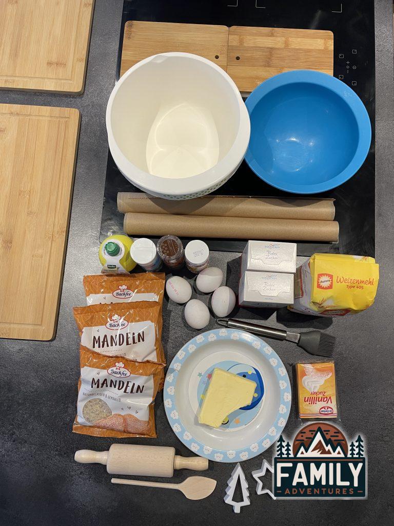 Um die beiden geplanten Rezepte zuzubereiten für gemeinsames Weihnachtsplätzchen backen mit den Kindern, benötigt man folgendes: