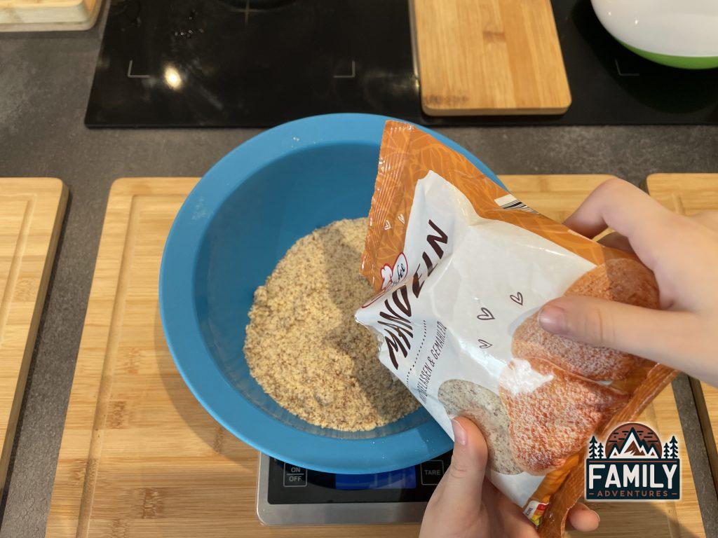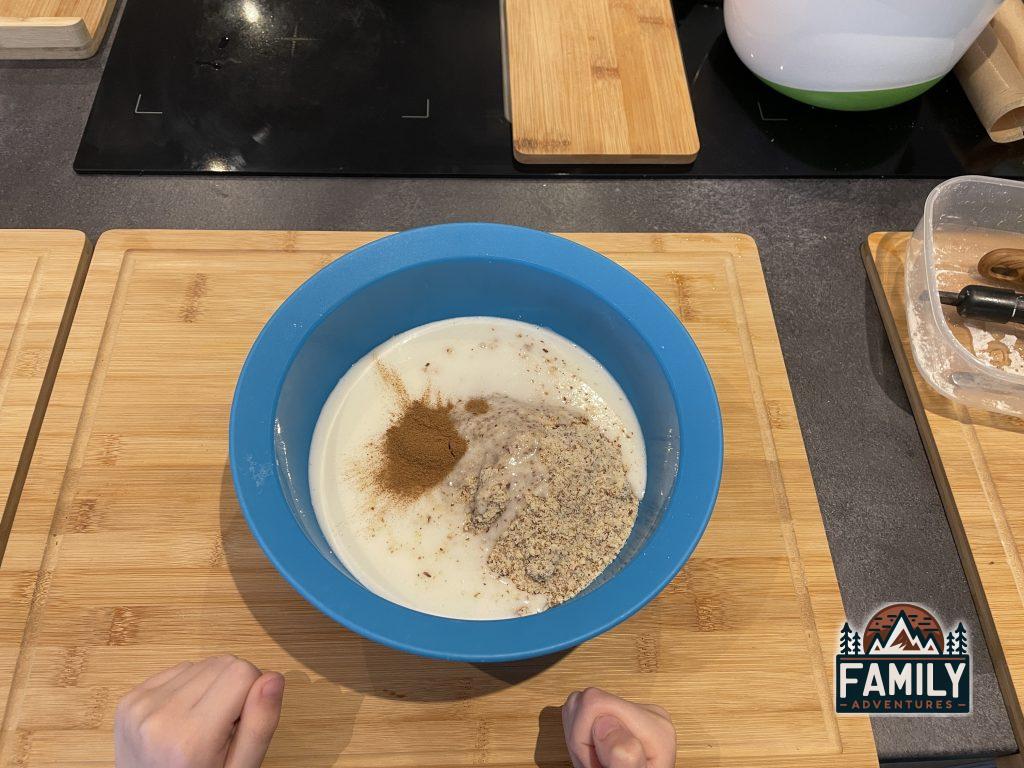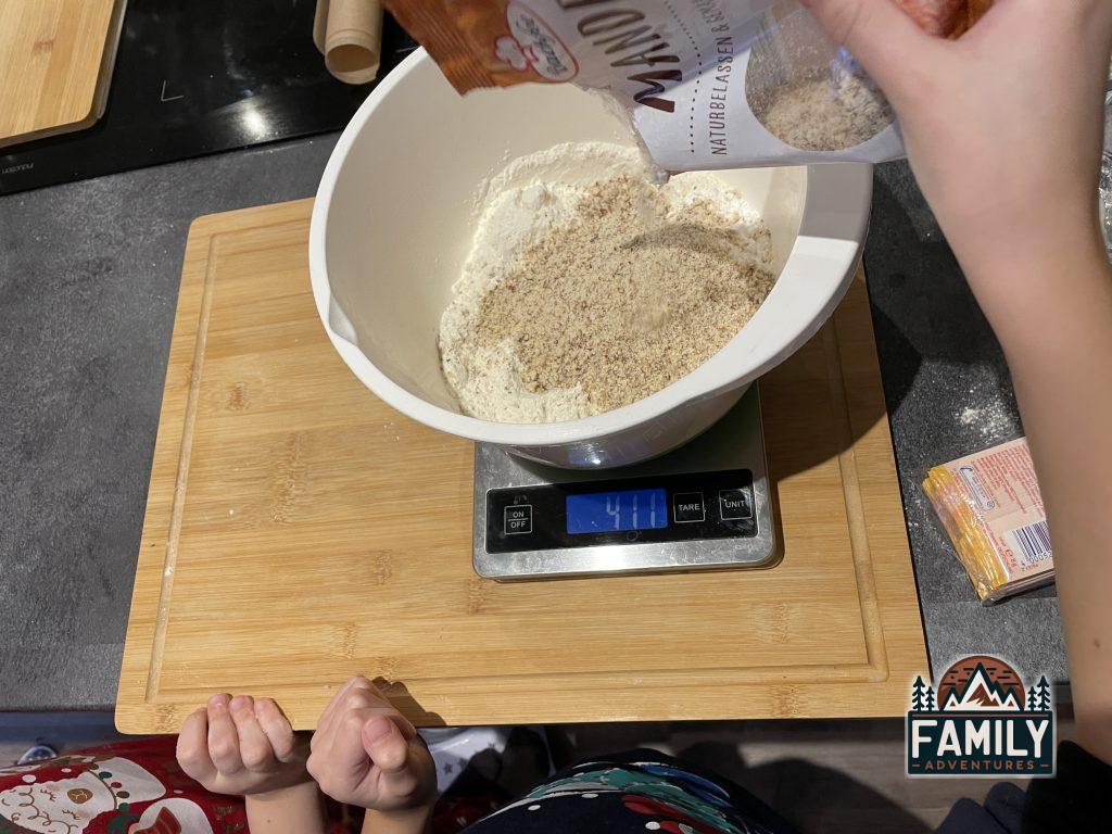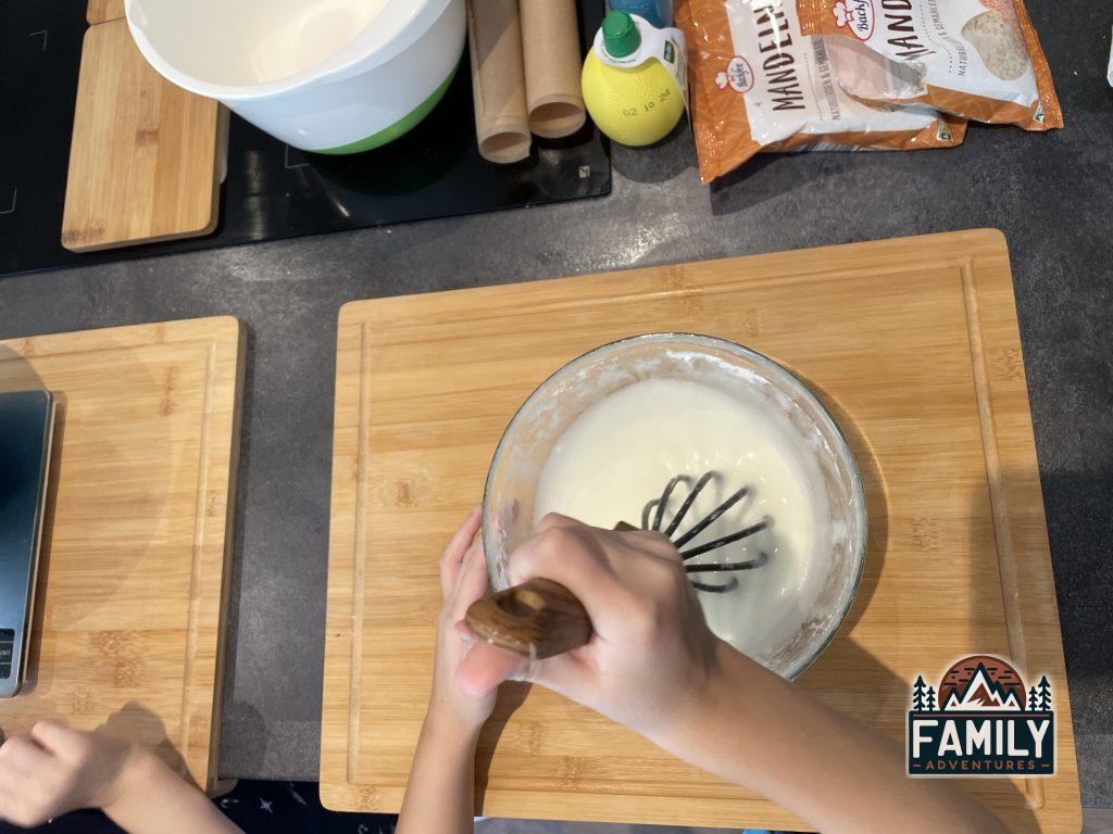 Ein Drittel der entstandenen Eiweiß-Puderzucker-Masse haben wir beiseite gelegt und die Kinder haben dann Mandeln und Zimt hinzugefügt. Anschließend musste alles gut vermischt und durchgeknetet werden.