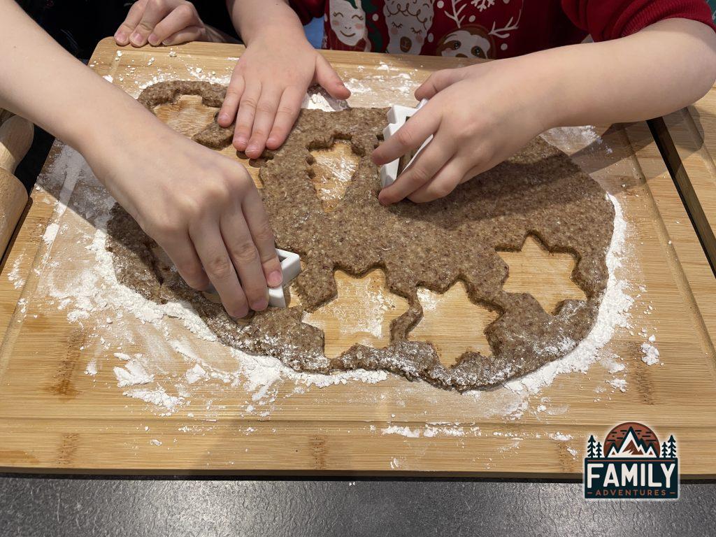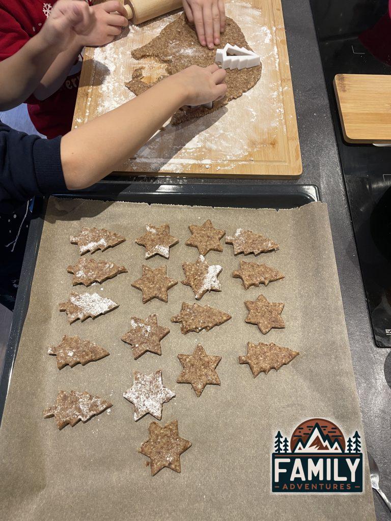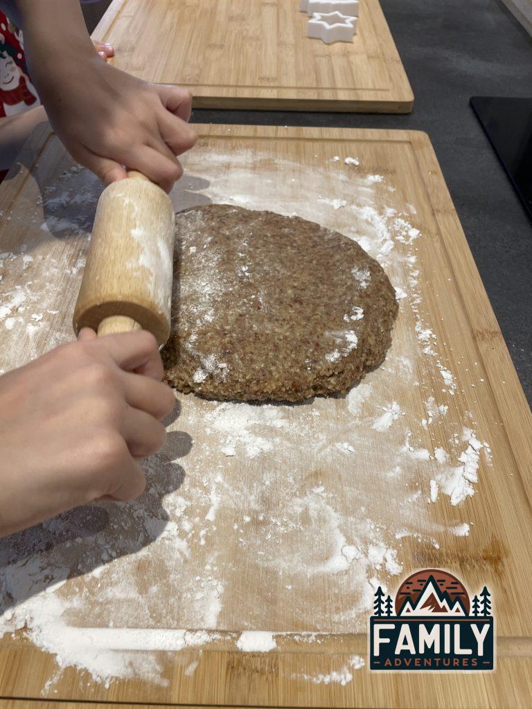 Danach haben die Kinder Puderzucker auf einem großen Holzschneidebrett verteilt, und gemeinsam haben wir den Zimtsternteig etwa 1 cm dick darauf ausgerollt. Jetzt kam der für die Kinder spaßigste Teil: das Ausstechen der Zimtsterne mit den Stern- und Baumausstechförmchen.