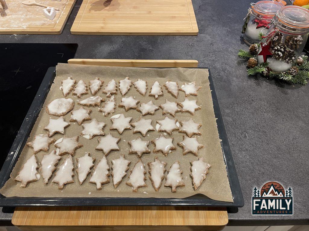 Zuletzt haben wir die Plätzchen mit dem beiseite gelegten Zuckerguss bestrichen und sie bei 150 °C Umluft etwa 12-15 Minuten gebacken.