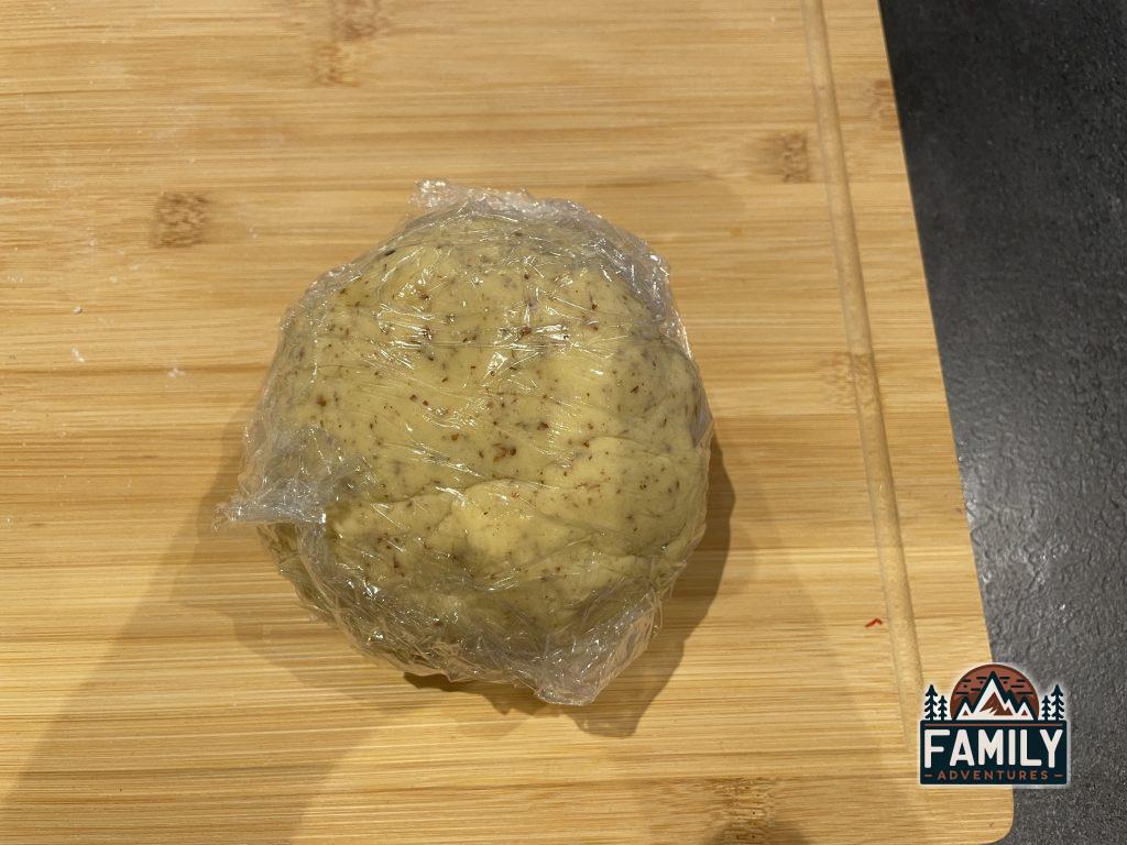 4. Den Teig in Frischhaltefolie wickeln und für mindestens 30 Minuten im Kühlschrank ruhen lassen.