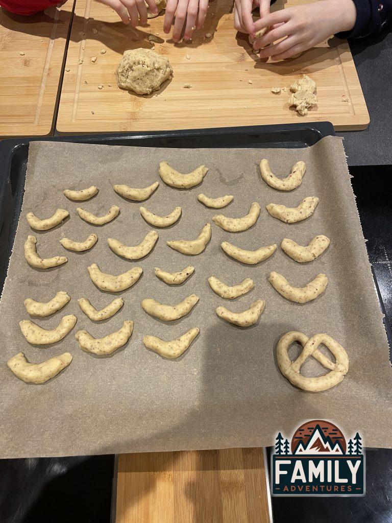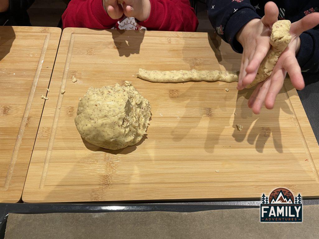 Nachdem der Teig 30 Minuten im Kühlschrank geruht hat, haben wir ihn wieder auf ein Holzschneidebrett gelegt, damit die Kinder ihn stückchenweise zu kleinen Hörnchen oder sogar zu Brezeln formen konnten.